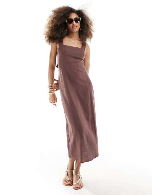 ASOS DESIGN square neck tie back linen midi sundress in chocolate brown