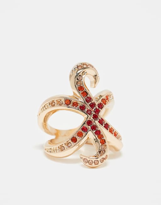 ASOS DESIGN starfish ring with red crystals in gold tone