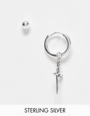 ASOS DESIGN sterling silver stud and dropped hoop earring with dagger in silver