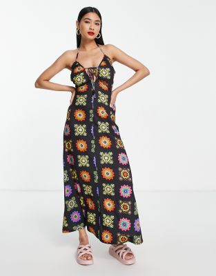 ASOS DESIGN strappy halter maxi dress in black crochet print