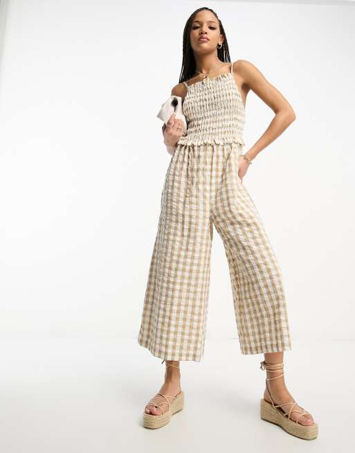 ASOS DESIGN strappy high neck shirred jumpsuit in gingham