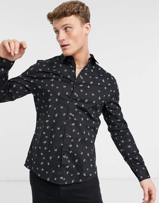 ASOS DESIGN stretch slim fit shirt with all over print in black
