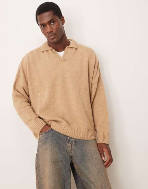 ASOS DESIGN super oversized boxy fit brushed knitted notch neck sweater in beige