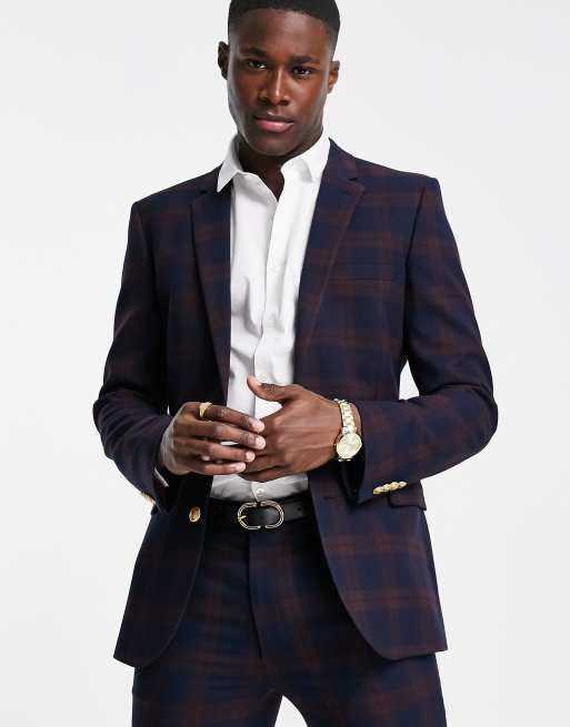 ASOS DESIGN super skinny suit jacket in burgundy mid scale check with gold button