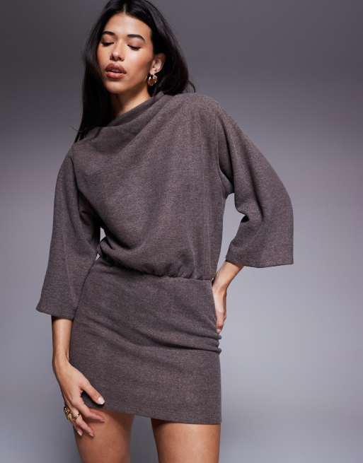 ASOS DESIGN supersoft high asymmetric neck blouson mini dress in chocolate heather