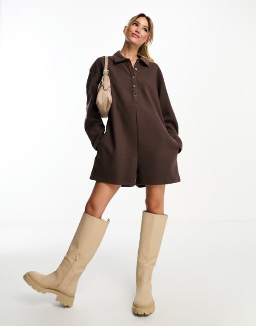 ASOS DESIGN supersoft ribbed romper with long sleeves in chocolate