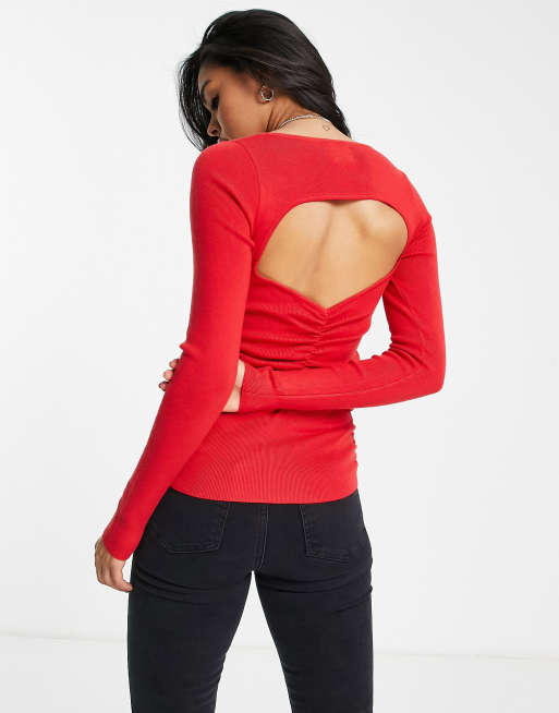 ASOS DESIGN sweater with cut out ruched back detail in red