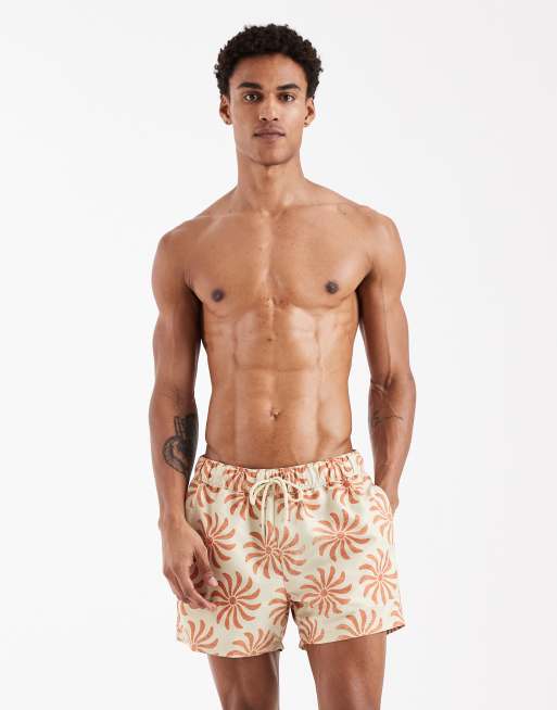 ASOS DESIGN swim shorts in short length with floral print in beige