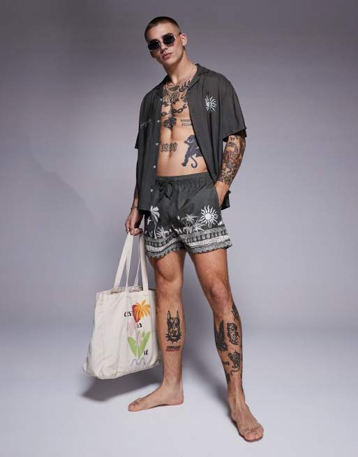 ASOS DESIGN swim shorts in short length with summer graphic in green - part of a set