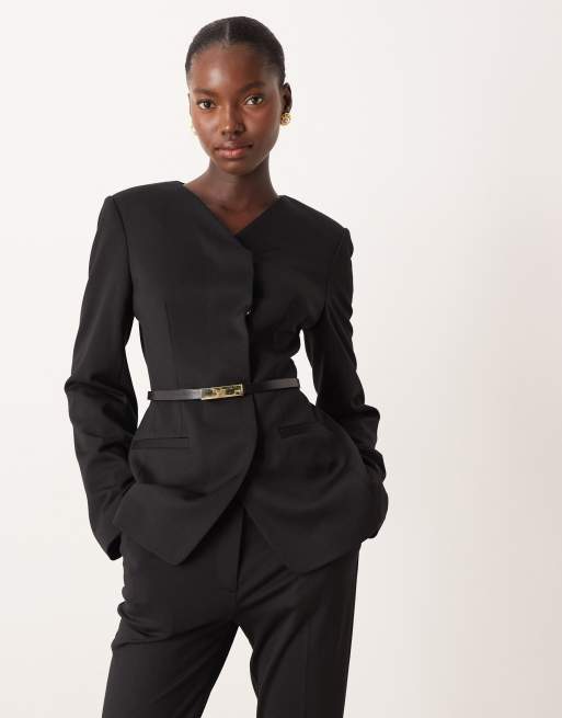 ASOS DESIGN tailored high break ponte suiting blazer with belt in black