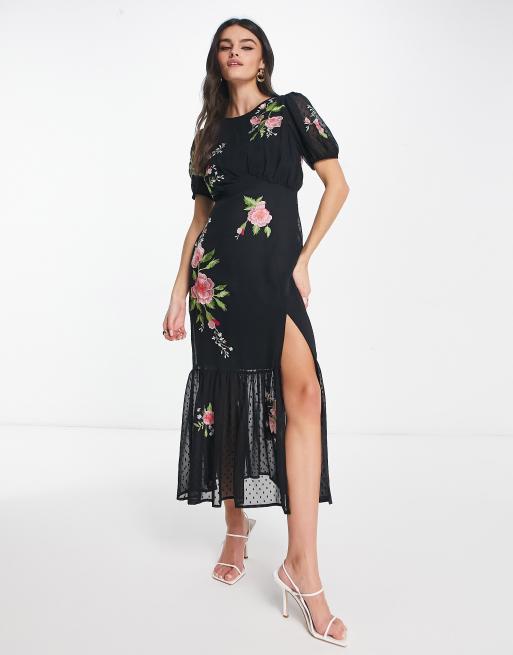 ASOS DESIGN textured chiffon puff sleeve midi tea dress with floral embroidery in black
