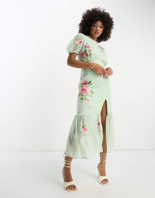 ASOS DESIGN textured chiffon puff sleeve midi tea dress with floral embroidery in pale green