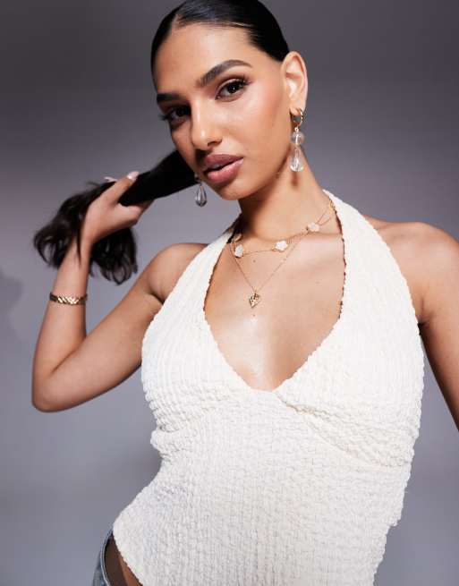 ASOS DESIGN textured halter neck top in ivory