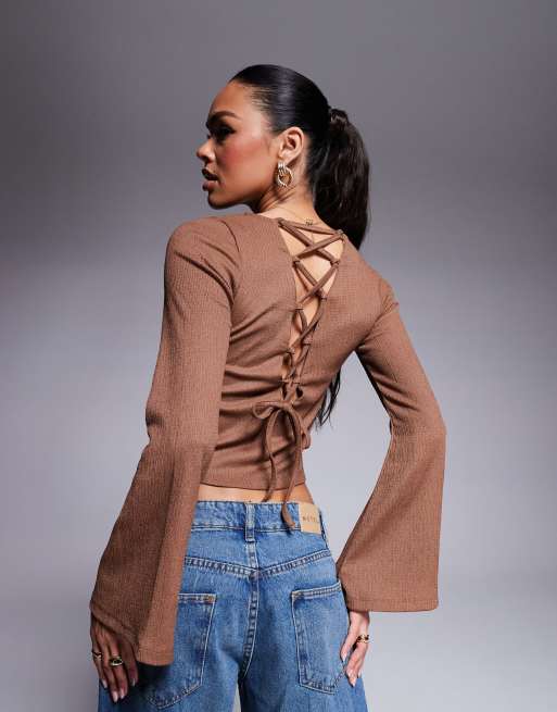 ASOS DESIGN textured lace up back fluted sleeve top in brown