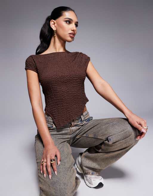 ASOS DESIGN textured off shoulder asymmetric hem top in brown
