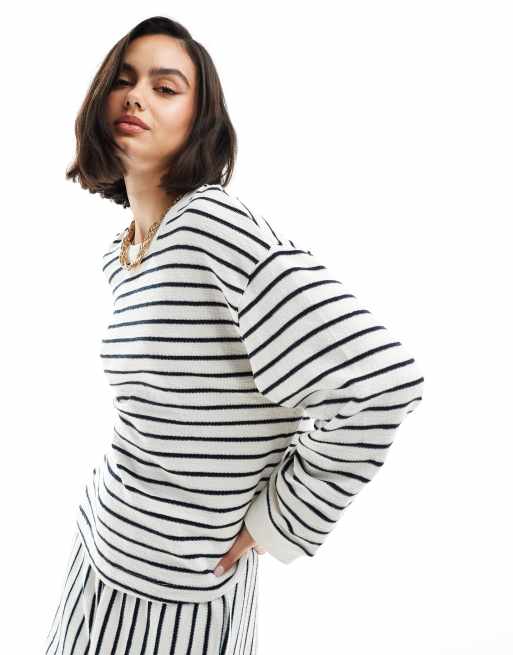 ASOS DESIGN textured striped long sleeve T-shirt in cream and navy - part of a set