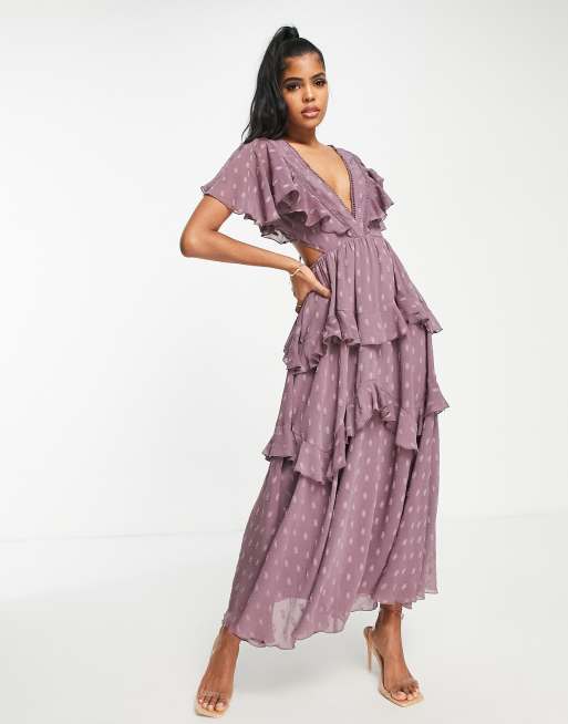 ASOS DESIGN textured tiered midi dress with lace insert and open back in mauve