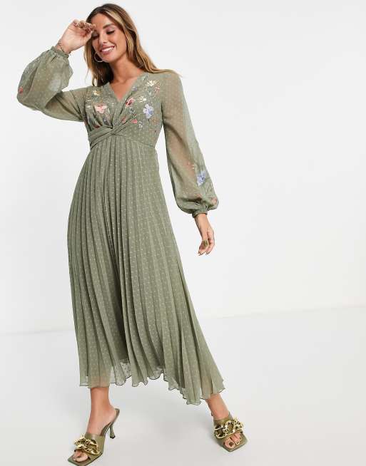 ASOS DESIGN textured twist front pleated midi dress with all-over embroidery in khaki