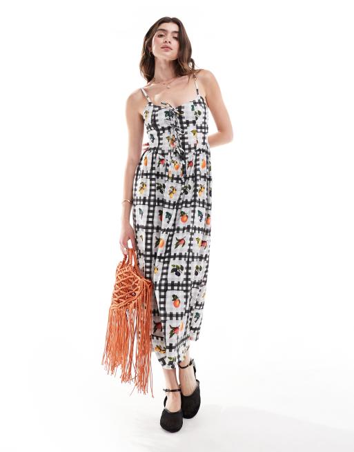 ASOS DESIGN tie front cami midi tea dress in black gingham fruit print