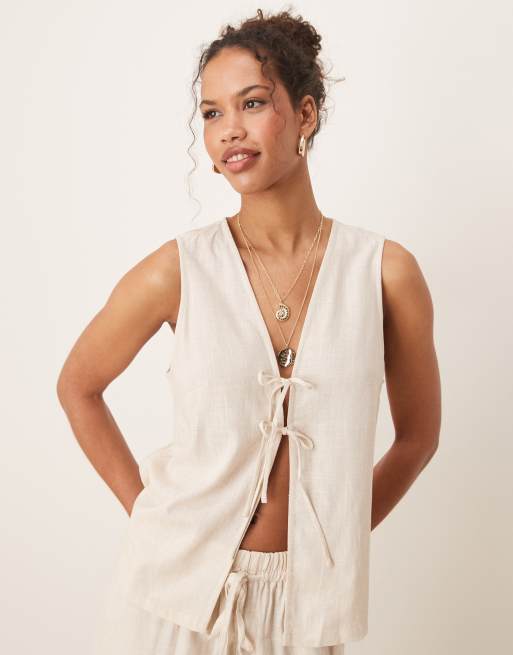 ASOS DESIGN tie front vest with linen in stone - part of a set