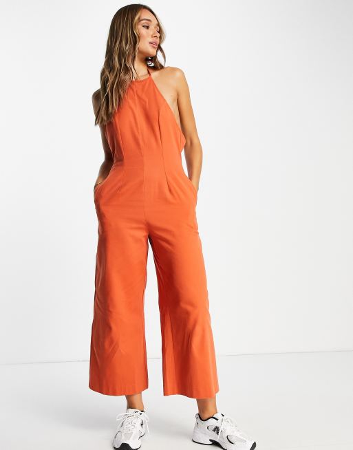 ASOS DESIGN twill strappy halterneck jumpsuit with wide leg in rust