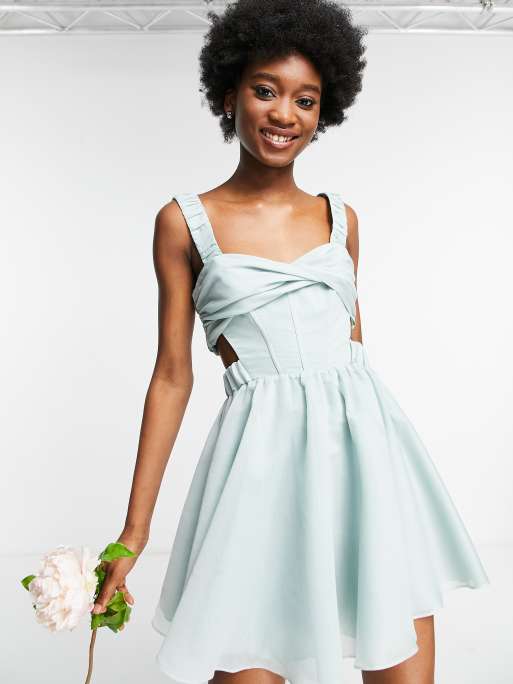 ASOS DESIGN twist front corset mini dress with ruched strap detail in blue