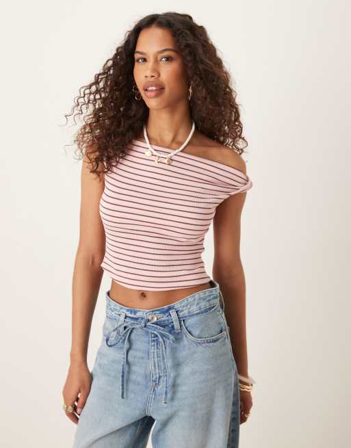 ASOS DESIGN twist shoulder bardot top in pink and choc stripe