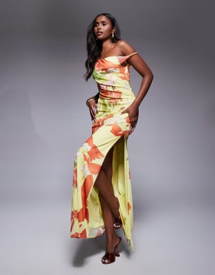 ASOS DESIGN twist shoulder mesh maxi dress with lace up back in yellow and orange floral print