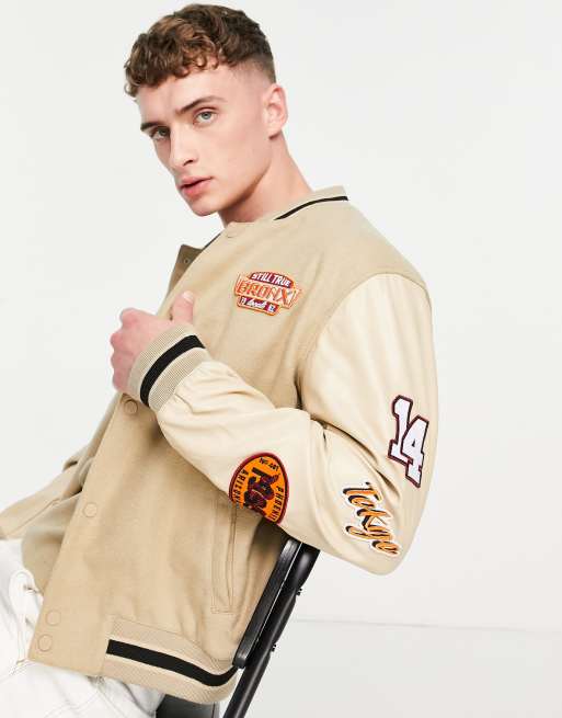 ASOS DESIGN varsity jacket with embroidered faux leather sleeves