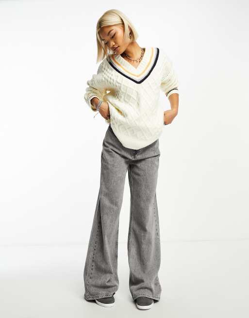 ASOS DESIGN varsity v neck cable sweater with tipping detail