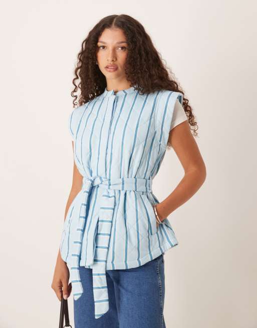 ASOS DESIGN vest with stripe quilted design and tie waist in blue