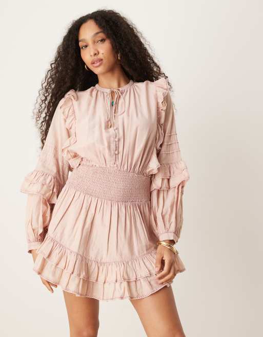 ASOS DESIGN voile mini dress with shirred waist and ruffle hem in washed pink