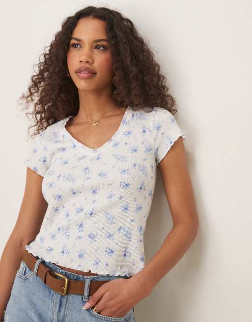ASOS DESIGN waffle v neck t-shirt with overlock trim in floral print