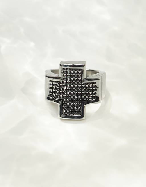 ASOS DESIGN waterproof stainless steel chunky ring with textured cross design in burnished silver tone
