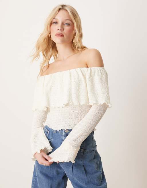 ASOS DESIGN wavy textured bardot top with fluted cuff detail in cream
