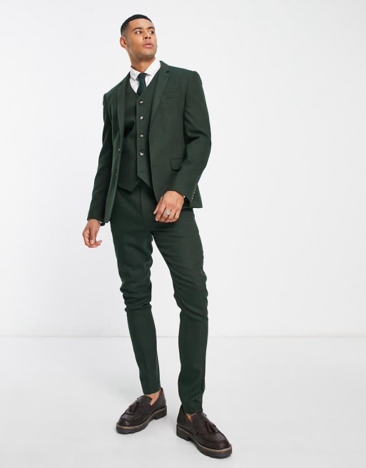 ASOS DESIGN wedding skinny wool mix suit in dark green basket weave texture