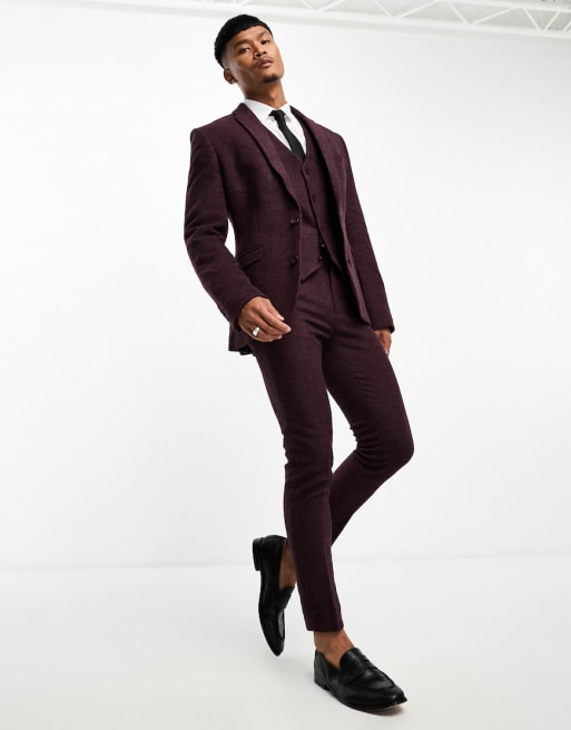 ASOS DESIGN wedding super skinny wool mix suit in burgundy puppytooth