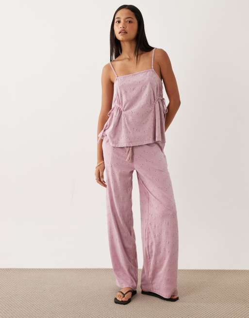ASOS DESIGN wide leg drawstring tassel detail jersey broderie set in lilac