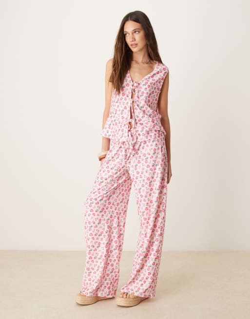 ASOS DESIGN wide leg tie front pants in pink ditsy floral