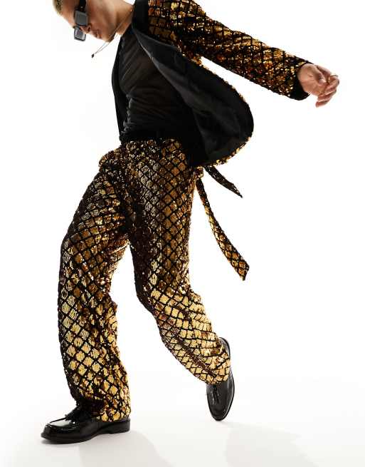 ASOS DESIGN wide suit pants in diamond sequin in black and gold