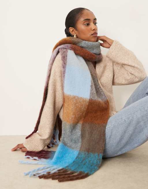 ASOS DESIGN woven tassel scarf blue and brown grid plaid design