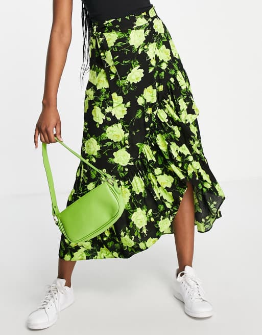 ASOS DESIGN wrap midi skirt with ruffle hem in neon floral print