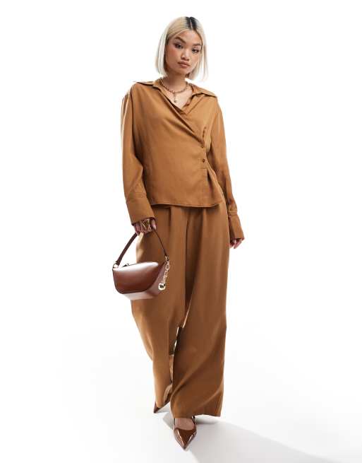 ASOS DESIGN wrap tie shirt & wide leg dad pants set in tan