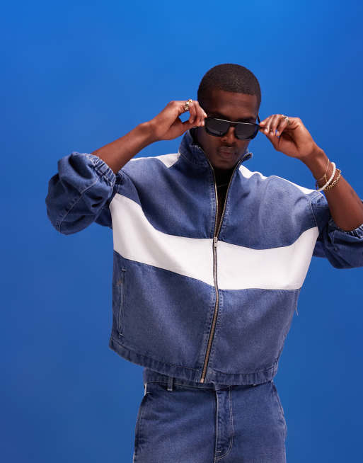 ASOS DESIGN zip up denim jacket with white panels in 90's mid wash blue - part of a set