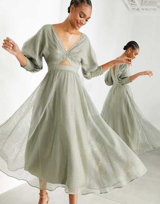ASOS EDITION blouson sleeve midi dress in organza check in khaki