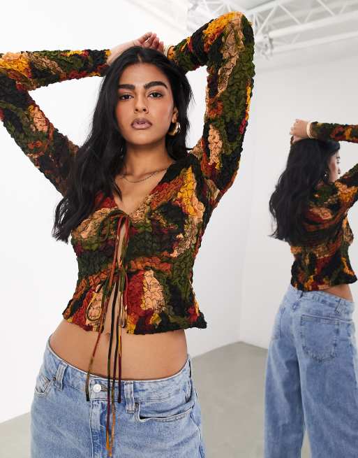 ASOS EDITION crinkle tie front long sleeve top in smudge print