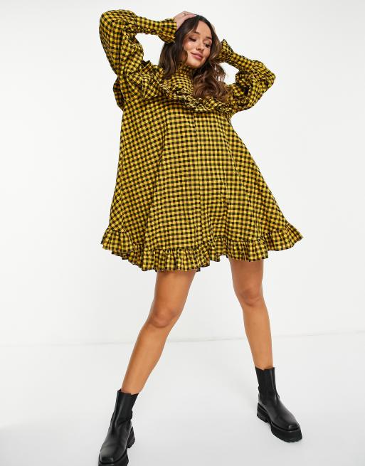 ASOS EDITION high neck ruffle yoke mini dress in mustard gingham plaid