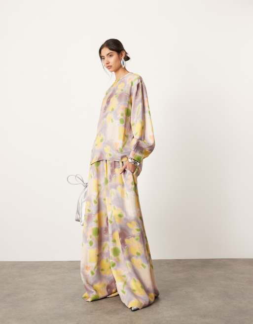 ASOS EDITION satin long sleeve top and wide leg drawstring waist pants set in blurred floral