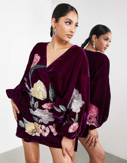 ASOS EDITION velvet wrap mini dress in dahlia floral embroidery in wine