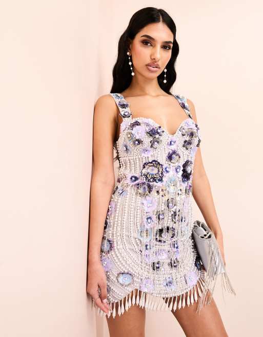 ASOS LUXE 3D floral embellished mini dress with scallop hem and drop pearl detail in blue